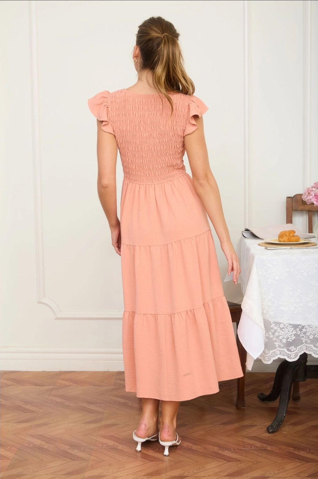 Peachy Flutter Sleeve V Neck Smocked Midi Dress